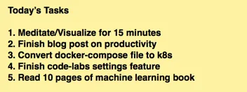 In addition to keeping my tasks focused and small, I also make a conscious effort to limit my list to 4 or 5 tasks initially. I’ve found that if I list more than 5 tasks I feel a bit overwhelmed which hurts my productivity. It’s easy to add additional tasks as you complete others and you get the added benefit of that confidence boost of knowing that you’re being productive and getting things done as you remove tasks and add others.