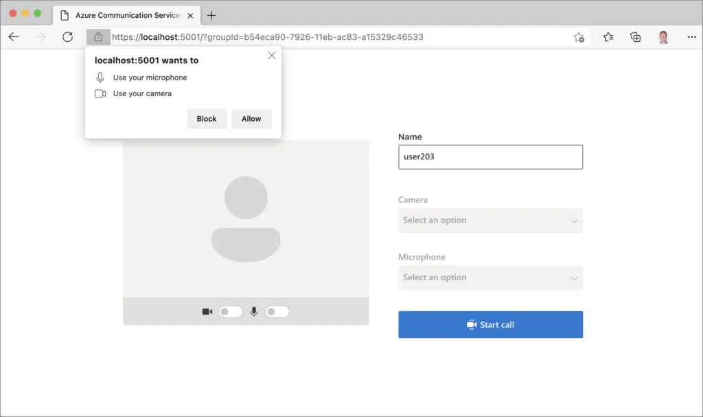 Click the Start a call button to initiate a call and you’ll be taken to another screen that prompts you to allow access to your microphone and camera: