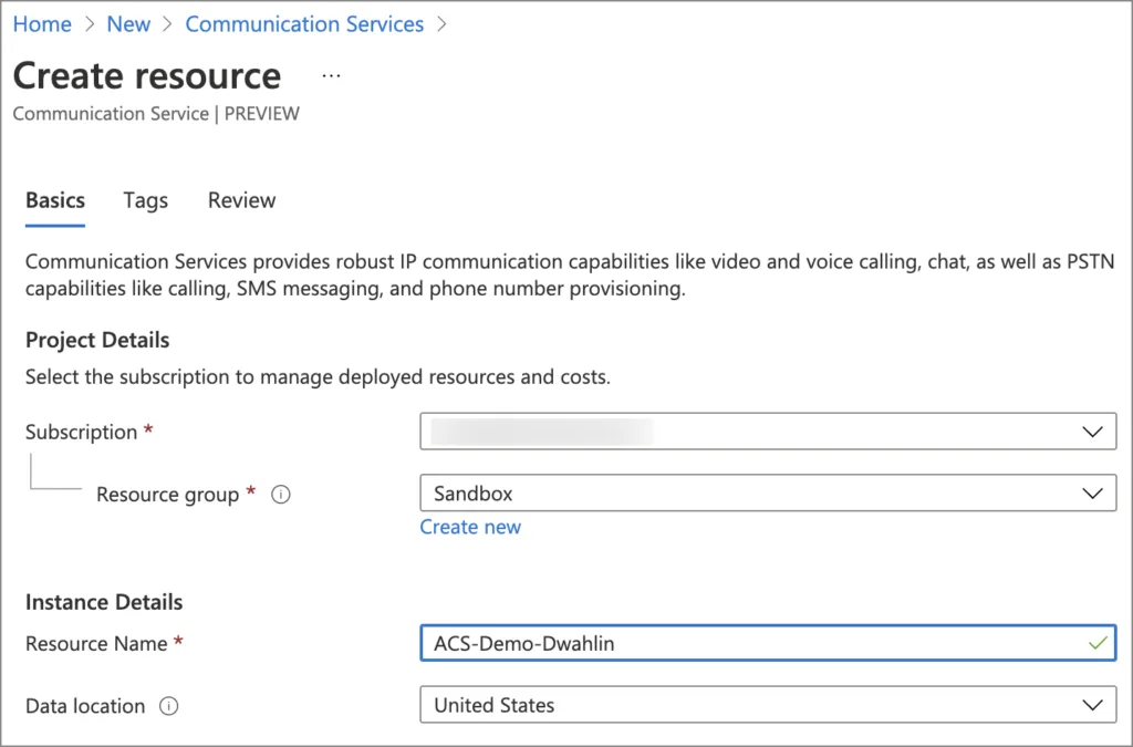 To create an ACS resource you’ll select your subscription and resource group names, enter the ACS resource name you’d like to use, and select your data location: