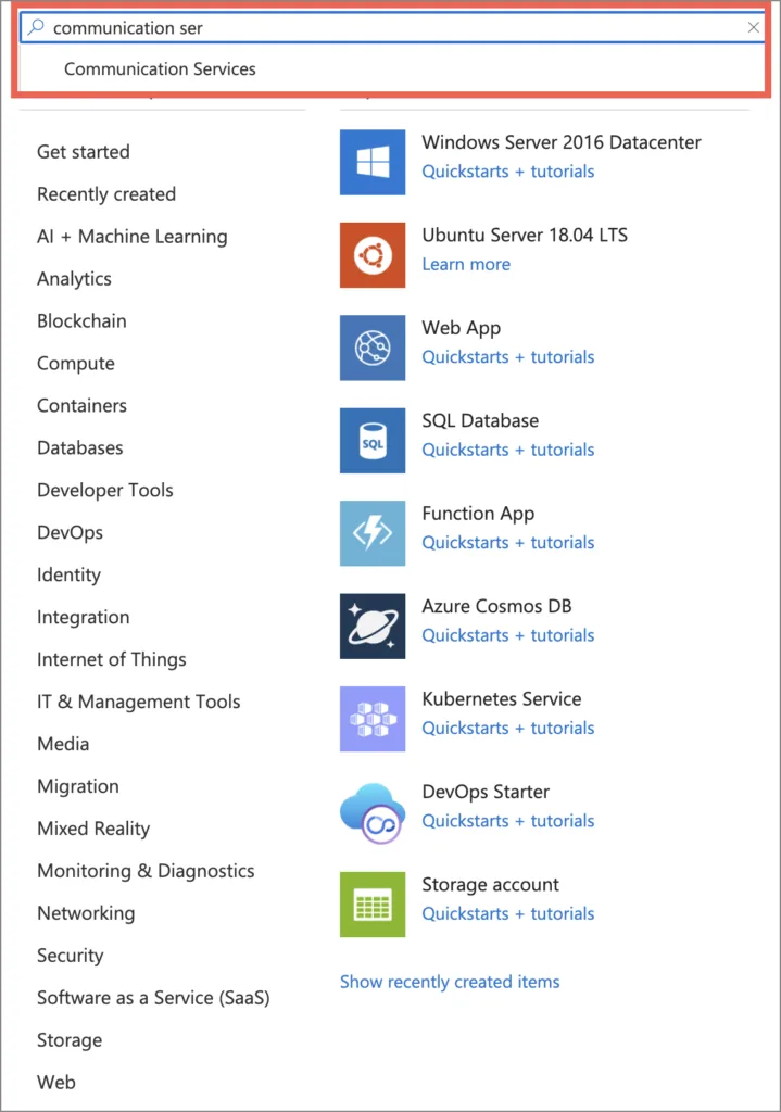 To get started visit https://portal.azure.com, login to the portal, and select Create a resource. In the Search the Marketplace textbox enter Communication Services and select that service once it is displayed.
