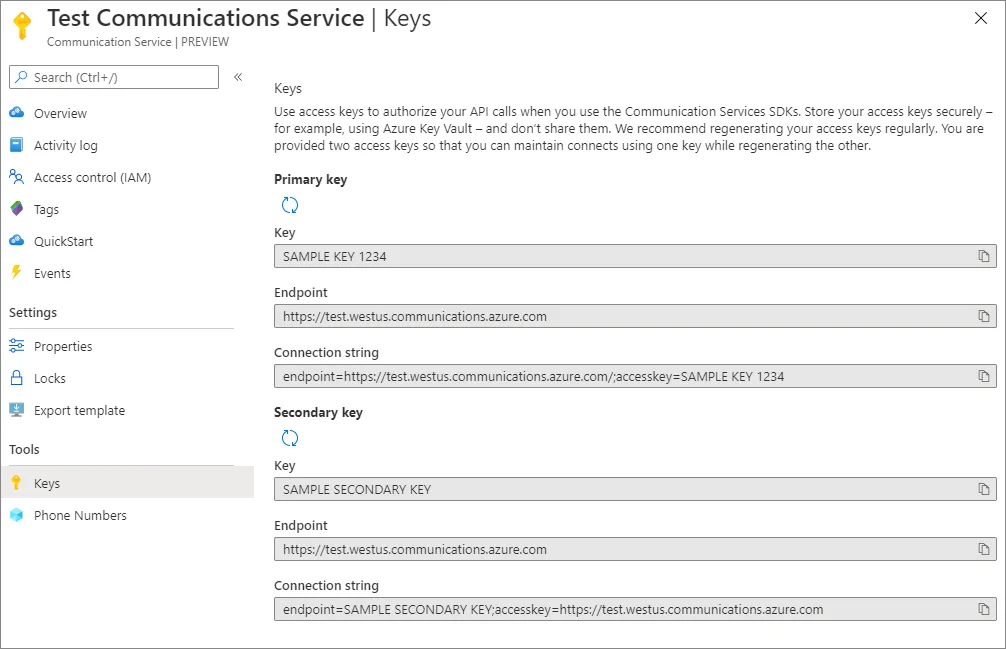 After the ACS resource is created you’ll see the standard overview page with information about your new ACS resources. Select the Keys option in the navigation menu to the left to view the keys and connection strings that can be used to authorize API calls from your client to ACS.