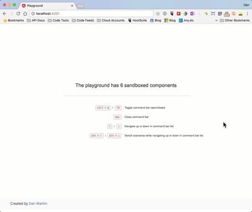 This creates a single scenario that runs the component. To try it out I went to http://localhost:4201 in the browser (recall that I ran npm run playground earlier to start the playground process) and pressed ctrl + p. I then typed the name of the scenario (the letter “A” will do here) in the command bar search box to select and run the about component. This particular scenario isn’t very interesting given the static data, but it made it easy to check if I had everything configured correctly for the playground to run.