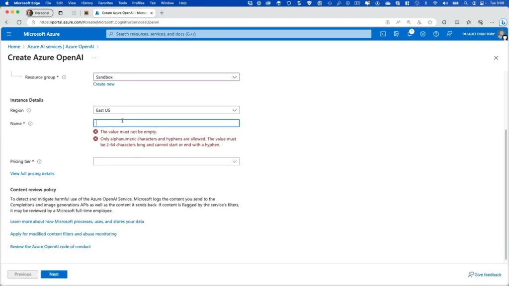 Once you’ve navigated to the Create Azure OpenAI page you can choose your subscription, preferred resource group, and region, and enter a name for the resource. The pricing tier currently has only one option (that’s subject to change in the future).
