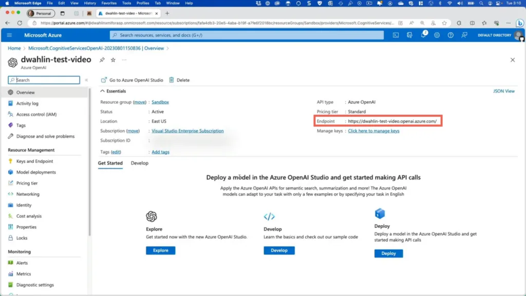 Once the deployment completes, you can explore the resource. In your Azure OpenAI resource Overview page you’ll find an endpoint. This is used along with a key to add Azure OpenAI capabilities to your apps.