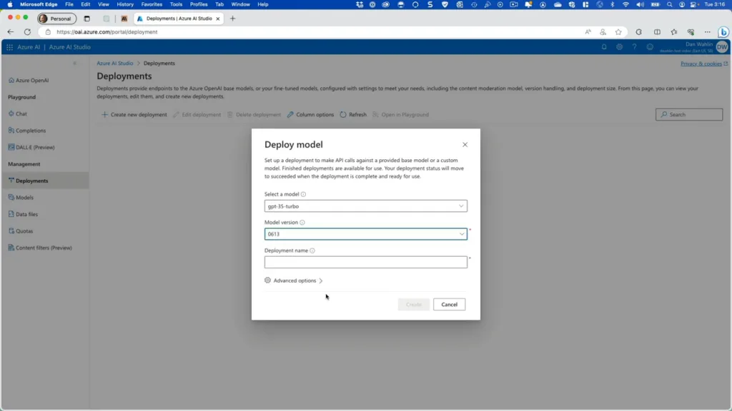 After setting the model and version, give your deployment a name. Something like gpt-35-turbo-0613 works fine. With everything in place you’re ready to select the Create button.