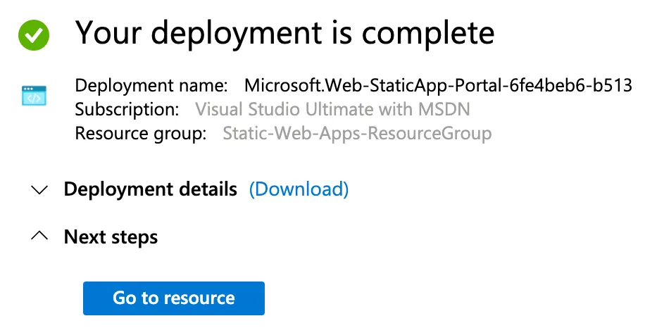 OK - coffee time’s over! Once your static web app is created, click the Go to resource button.