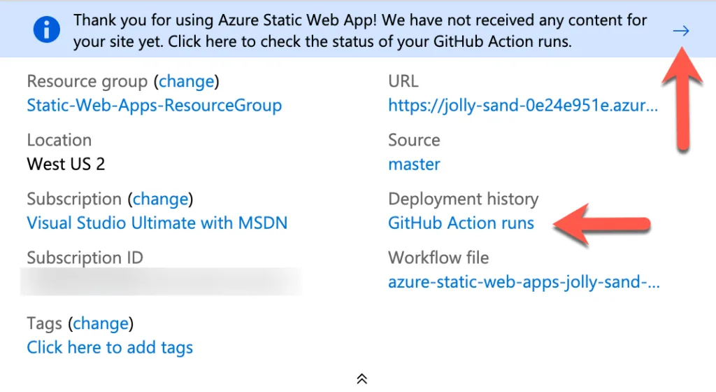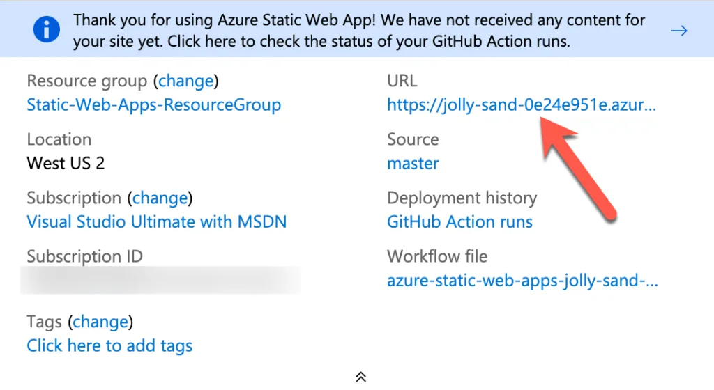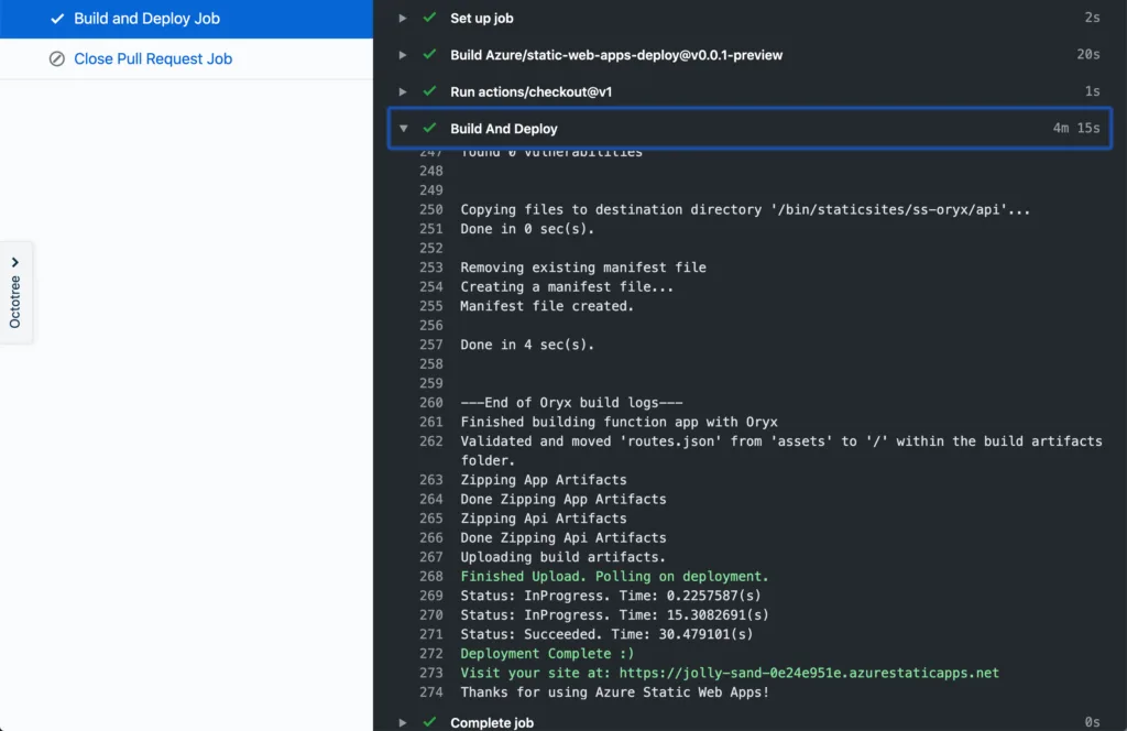 It’s time to launch your static web app! Review the summary information provided and then click the Create button. Go grab a coffee, kick back, relax, and watch a (super short) YouTube video while a Github Action builds your code and deploys it to Azure automatically.
