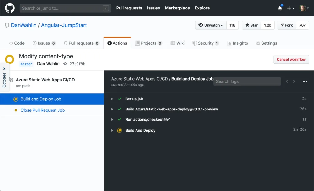 Here’s an example of what the Github Action build created in your repository by Azure Static Web App looks like. This repository is located at https://github.com/DanWahlin/Angular-JumpStart if you want to try one out that already has an app and functions available. Every time you push code to your chosen repository branch the Github Action build process kicks off automatically.