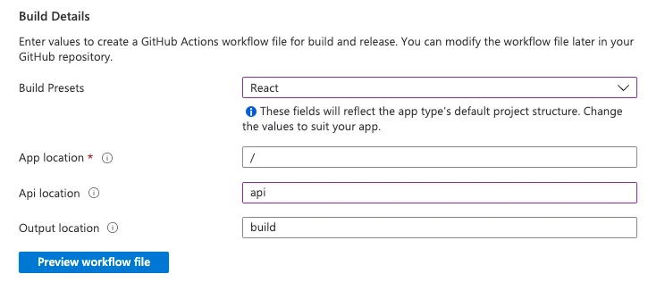 The next step is to define where your app is located in the repository, where your Azure Functions APIs are located, and the directory where your build artifacts (your bundles) are located. You can even preview the workflow file that will be added to your Github repository.