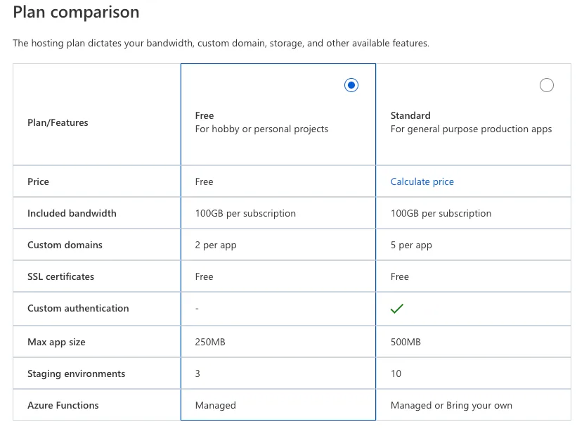 Microsoft announced the Azure Static Web Apps service at their Build 2020 conference. I was fortunate to get early access and have been really impressed with the functionality they’re providing. Since then, they’ve made the service “GA” (generally available) and currently support 2 plans. The free plan allows you to get started absolutely free while the standard plan includes all of the free features as well as the ability to customize functionality such as authentication and APIs.