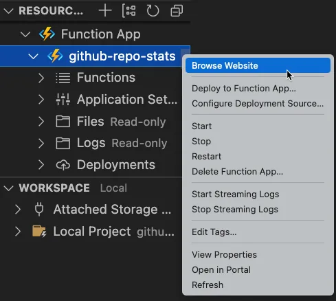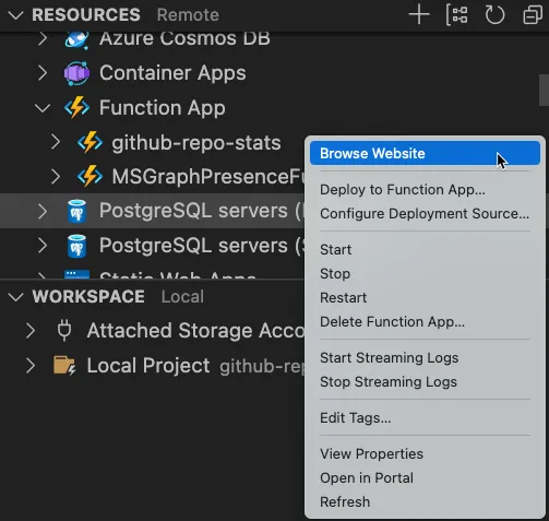 Using the Azure VS Code extension to browser your Azure Functions website