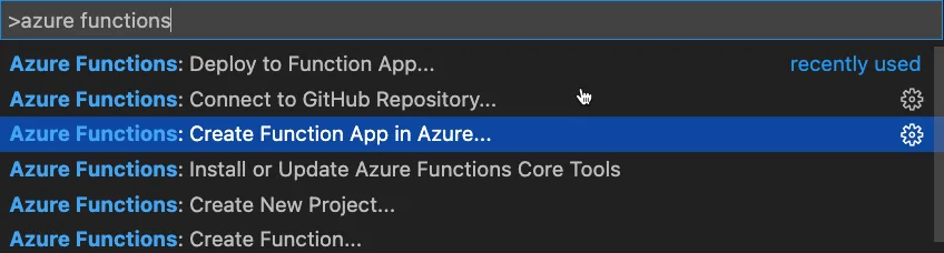 Now that the function was working locally it was time to deploy it to Azure. I stopped my debugging session, went to the command pallet (shift+cmd+p on Mac), and selected Azure Functions: Create Function App in Azure.